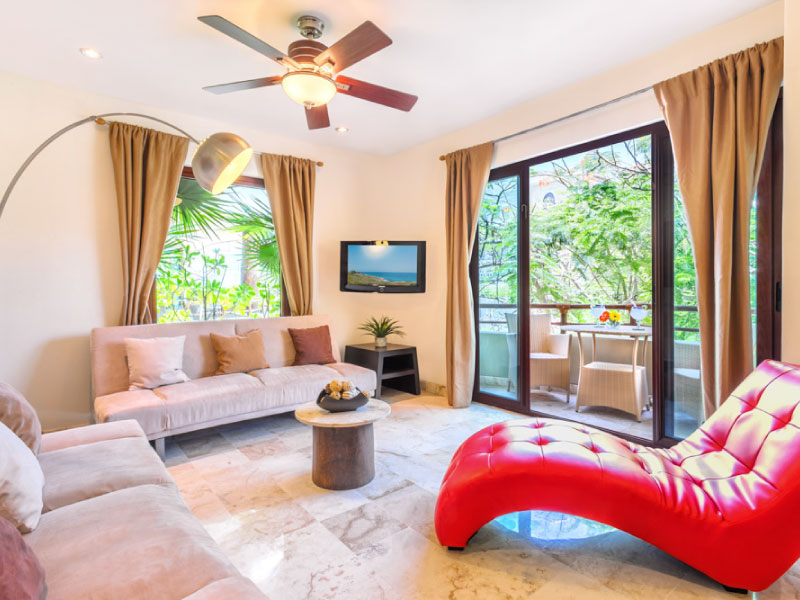 This first floor one bedroom (sanctuary level) unit is decorated in bright colors that define an elegant tropical influence.